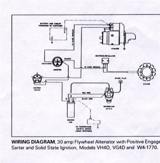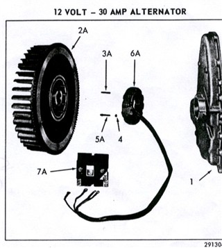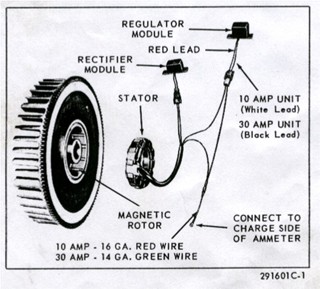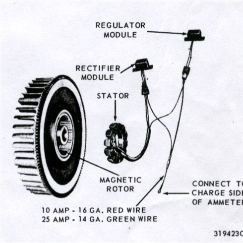 ![]() 30 amp system used on engine models AGND, THD, TJD, VE4D, VF4D, VH4D, VG4D Very early style 30 amp system. Square black box with plates bolted together as a heat sink. Stator wires have ring terminals which are attached to the regulator / rectifier module by nuts and lock washers. The casting # of the flywheel is usually N103, N102, N101, N100. This system can be on engines built in the 50's and 60's. |