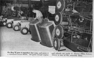 As time progressed, other improvements evolved. The Philippine mahogany doors were replaced by aluminum doors and, near the end, steel doors. The electrical system was upgraded from 6 to 12 volts in 1961. The old standby Wisconsin AENL engine was replaced by a 12 horsepower Kohler K301 engine in 1966. The clicker low speed pulley was replaced by a silent Borg-Warner one-way clutch in 1967. The brown canvas top was replaced by a vinyl covered black or white top. An optional electric windshield wiper was offered, along with a windshield washer, radio, carpeted panels, floor mats, safety belts and new paint colors: Corinthian white, Rangoon red, yellow, blue and aqua.